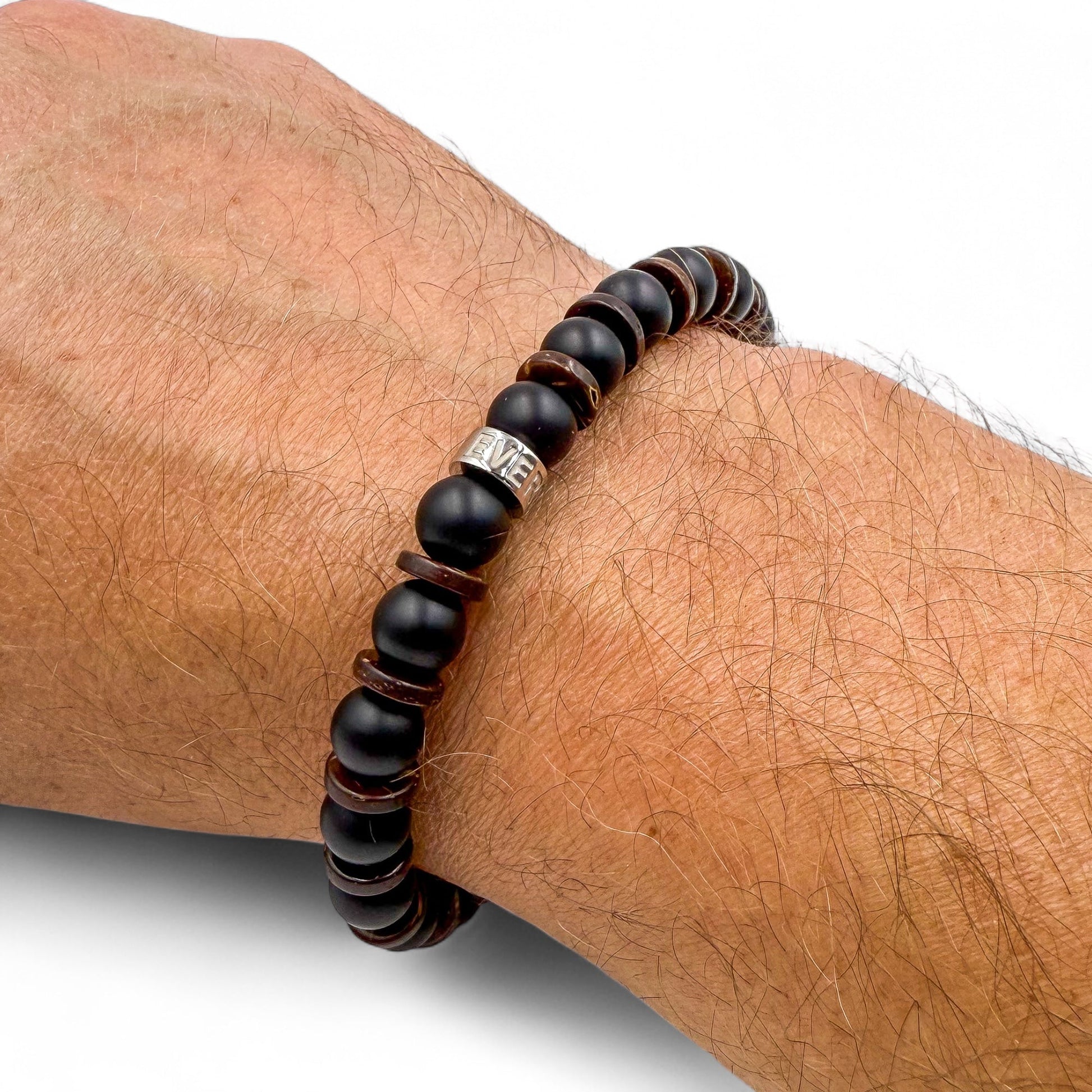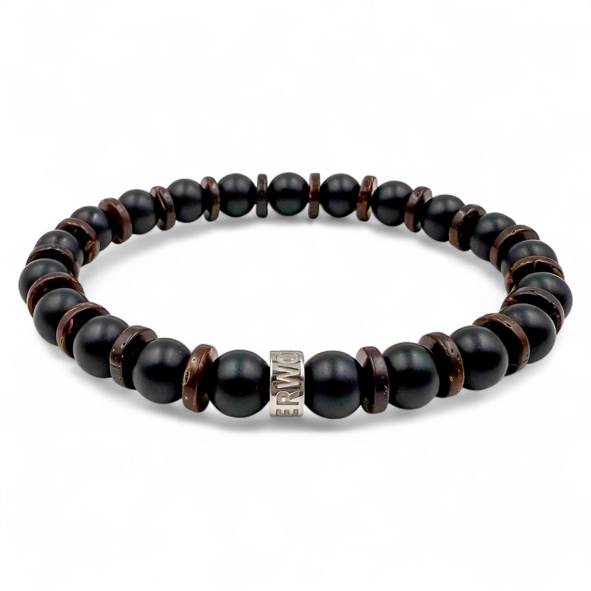 Where city grit meets natural grit. The Blacktop Timber bracelet fuses the bold, matte finish of black onyx with the raw texture of brown coconut wood beads, creating a look that’s clean, grounded, and effortlessly cool. Anchored by a polished silver stainless steel spacer engraved with the EVERWOOD mark, this piece is built for the man who moves between concrete and wilderness without missing a beat. From office hours to after hours, Blacktop Timber is your go-to for low-key confidence and high-style impact.