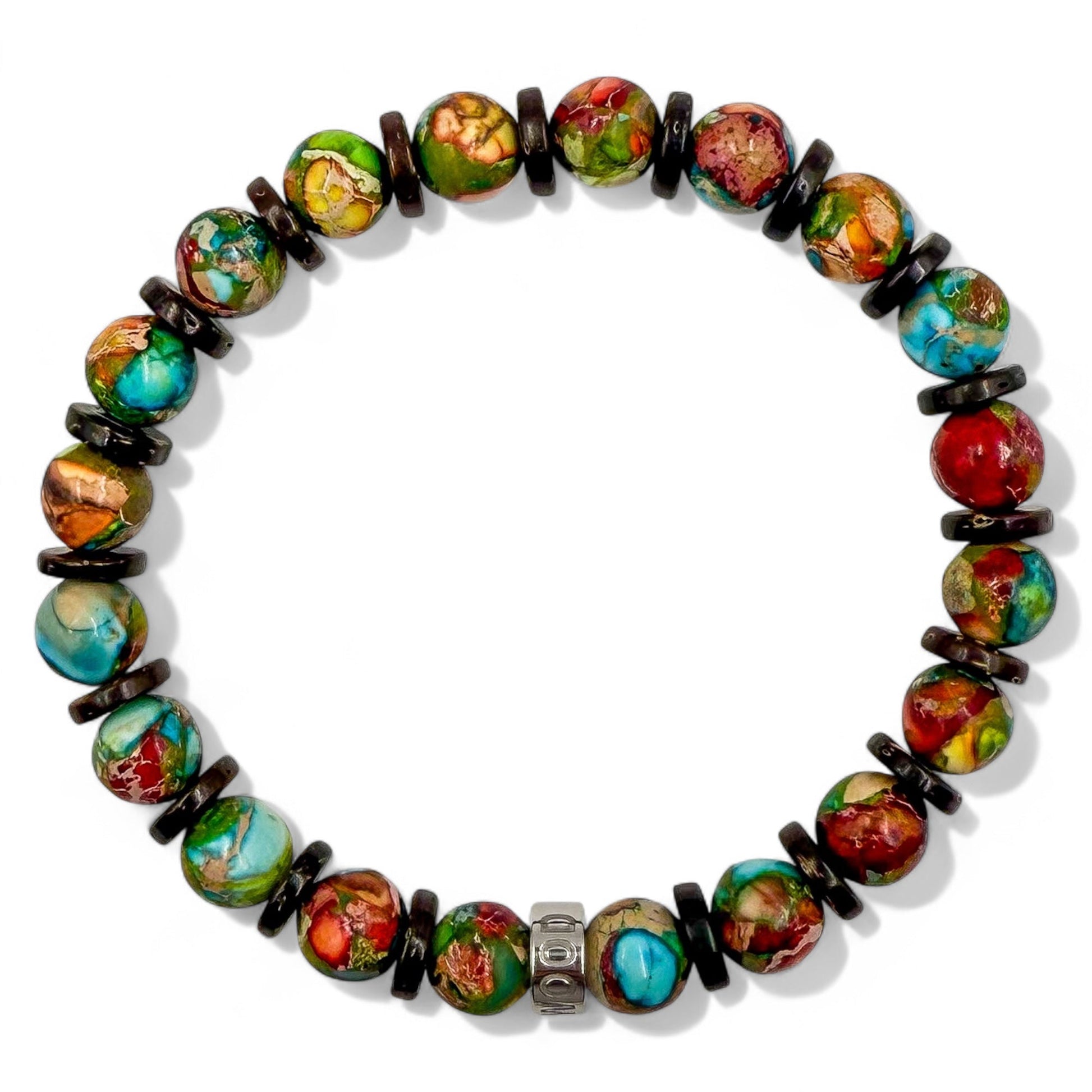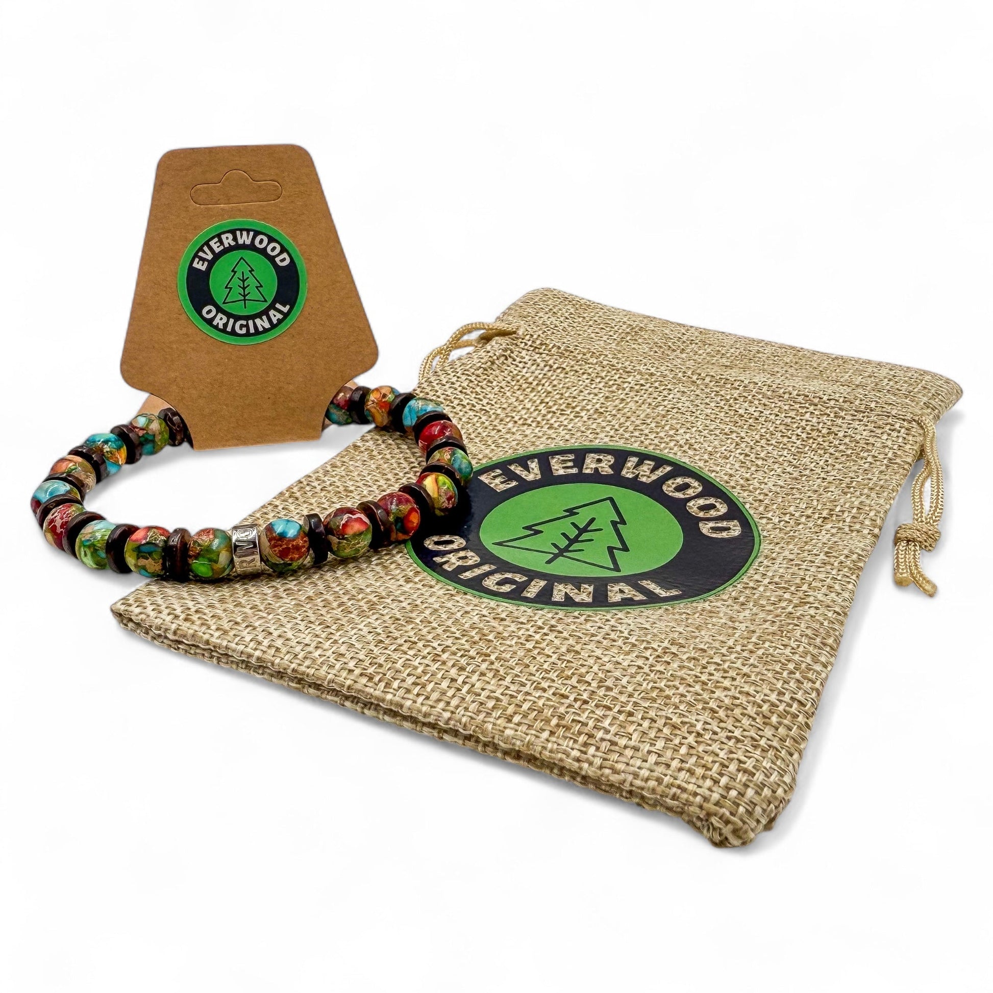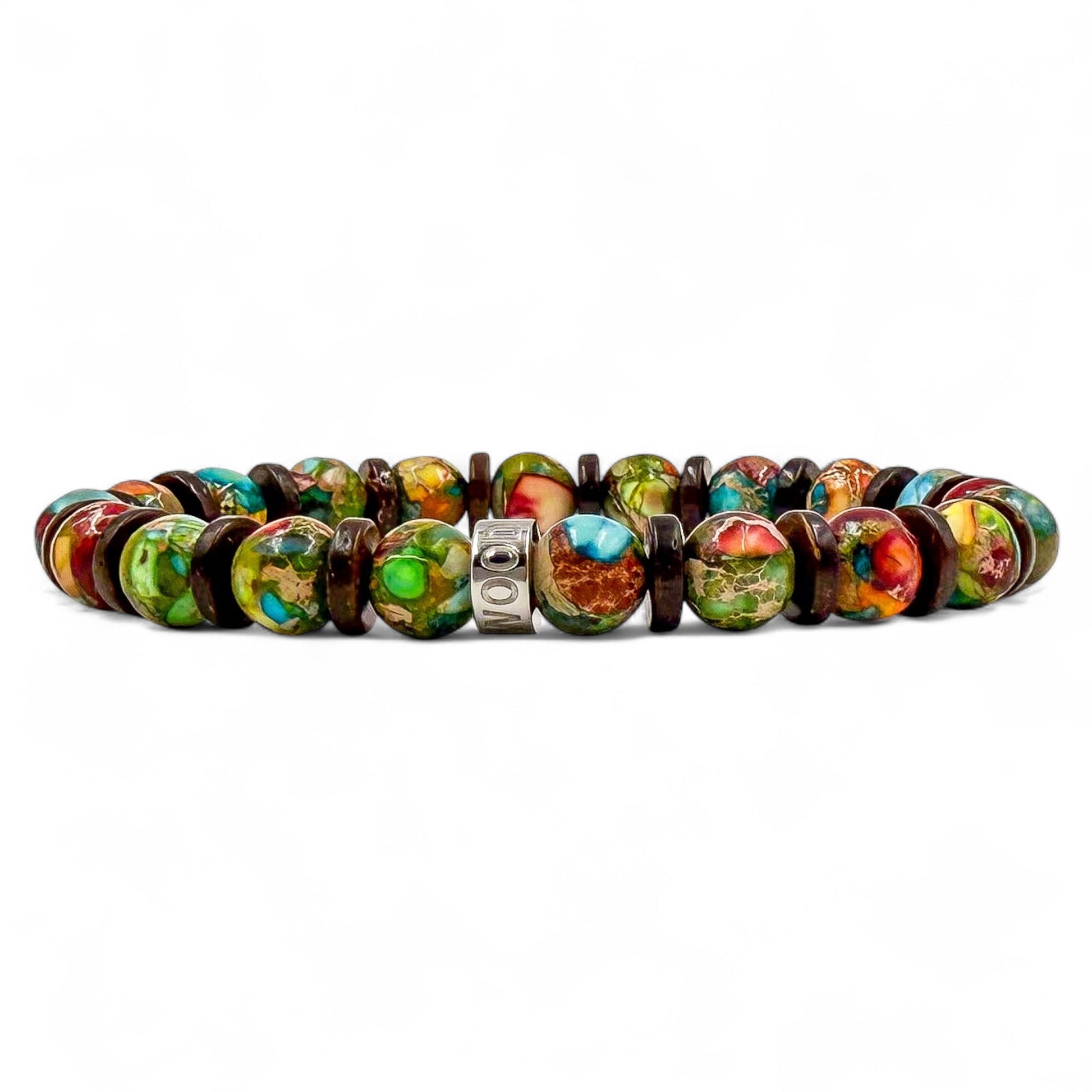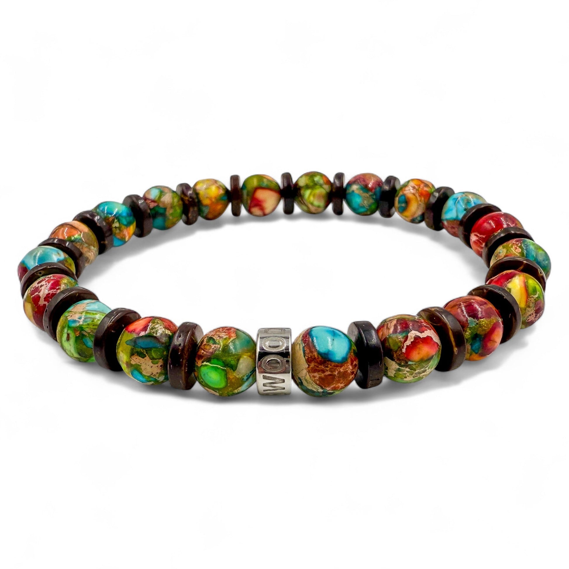 Turn heads without saying a word. The Jungle Fiesta bracelet is all about bold color and natural style. With vibrant rainbow jasper beads bringing the energy and warm brown coconut wood adding that earthy balance, this piece is like a tropical escape for your wrist. The polished silver stainless steel spacer—engraved with the EVERWOOD name—adds a clean, premium finish. Perfect for summer vibes, weekend getaways, or just breaking up the black-and-grey wardrobe, Jungle Fiesta brings personality and punch to your everyday carry.